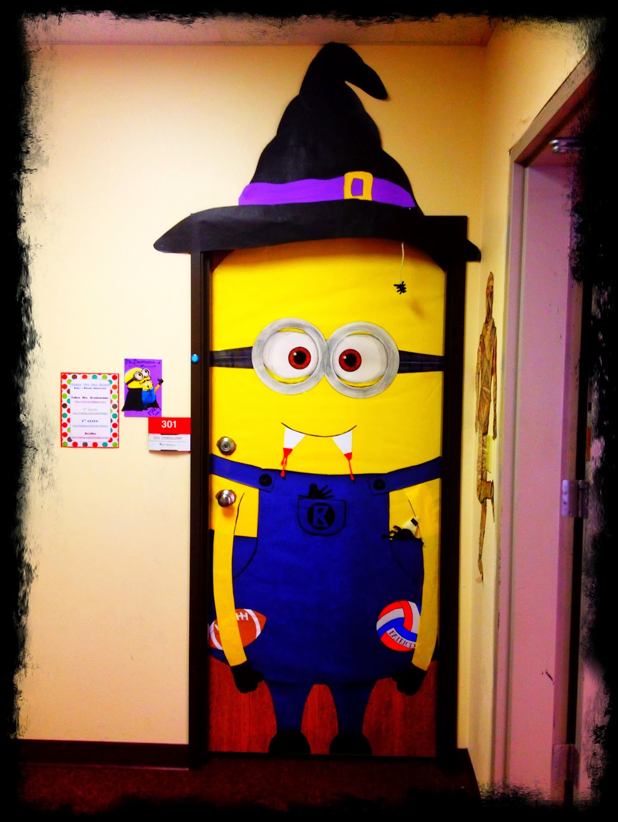 To add to the fun, each of the students has a minion on their locker with their name. I had an extra minion, and made one for outside my classroom door. I didn't want to leave him out of the Halloween fun, so using an overhead marker (he's been laminated), I added a mustache, goatee and the right side of the cape. The larger part of the cape is black card stock.